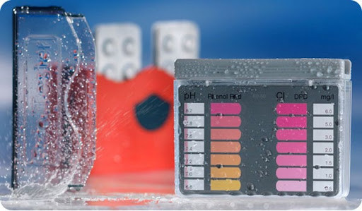 - Тест смужки. Доступні та прості лакмусові папірці з нанесеними реагентами допомагають швидко визначити потрібний показник. Тестер опускається в басейн і порівнюється за кольором зі шкалою індикаторів та значень. Слабкістю тест-смужок є волога, при неправильному зберіганні папір промокає і може давати помилкові показники, тому основний комплект смужок слід убезпечити від потрапляння води.