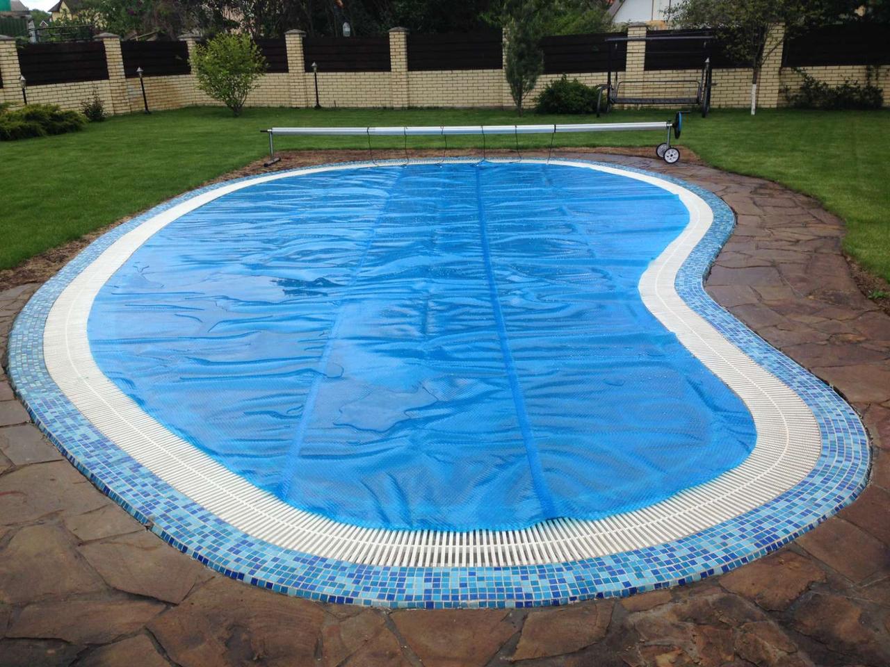 Таке накриття можна підібрати під будь-які розміри басейну (купується полотно правильної форми та обрізається під необхідні заміри). Матеріал є доступним по ціні та легким в установці, дозволяє зменшити витрати та експлуатацію конструкції. При цьому важливо зауважити, що солярна плівка не є надійним захистом в ситуаціях з непередбачуваним падінням в басейн. Вона також не витримає великого навантаження опадів, тому не рекомендована для застосування в зимовий період.