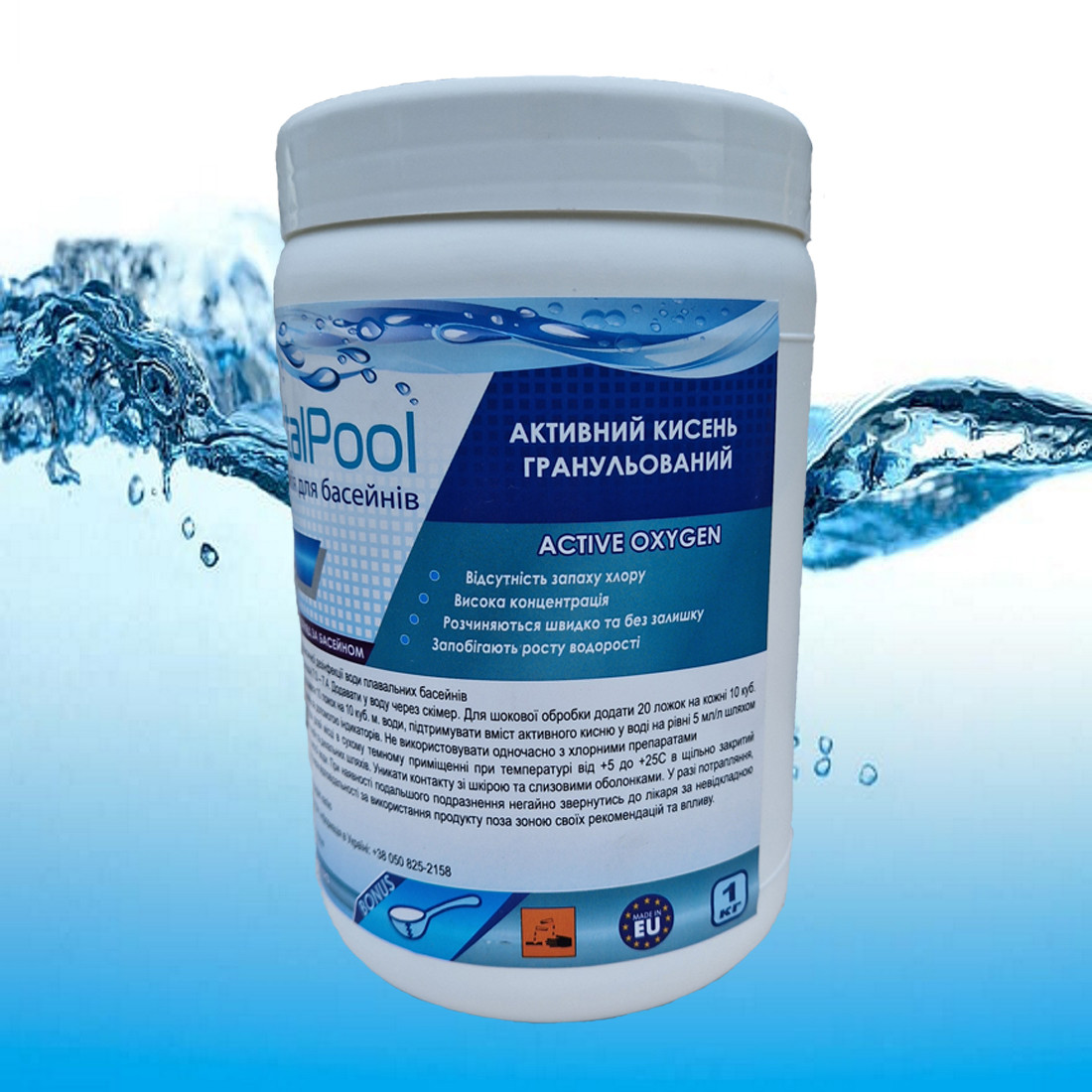 - Активний кисень. Сучасний препарат для дезінфекції, використання якого дозволяє зробити воду чистою, а купання комфортним та безпечним. Серед головних переваг засобу: може використовуватися при будь-якому рівні кислотно-лужного балансу, застосовується для обробки басейнів, як відкритого, так і закритого типу.